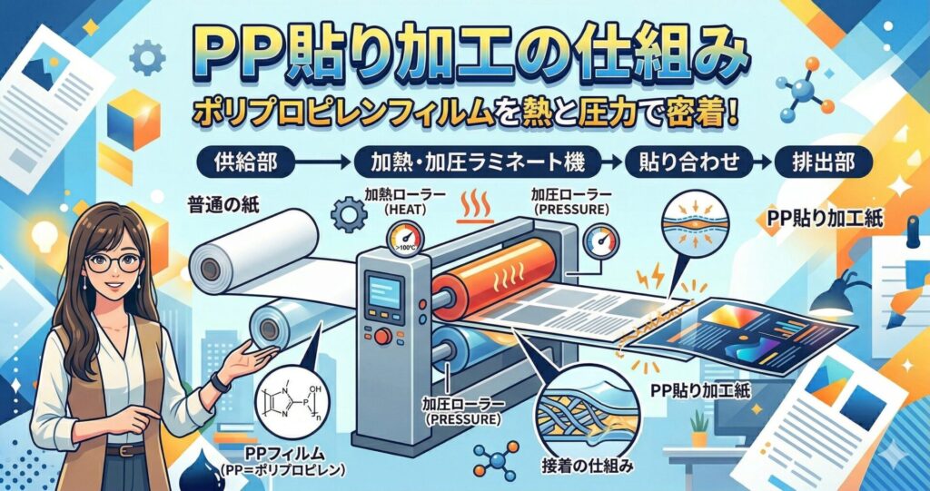 PPとは「ポリプロピレン」というプラスチック素材の略称です 。この薄いフィルムを、熱と圧力を使って紙の表面にピタッと貼り合わせます 。